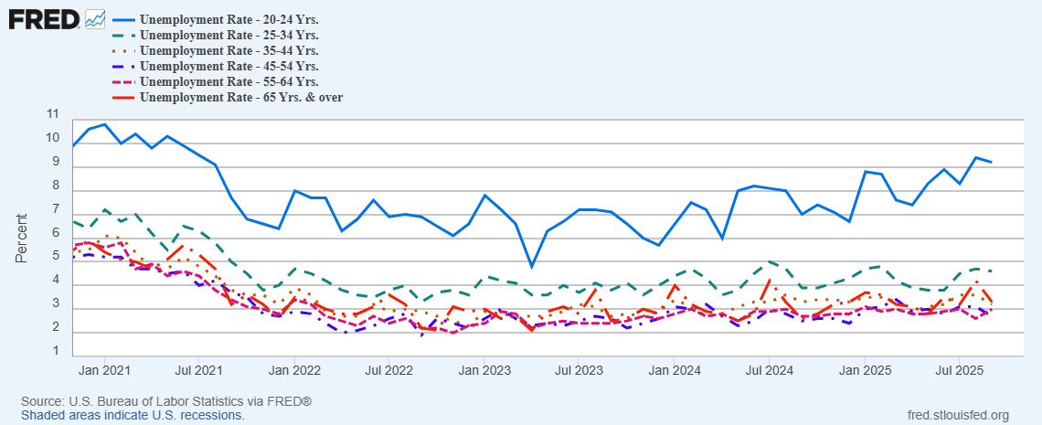 Delinquencies on credit cards and auto loans have been rising for much of the year. Overall, unemployment has hovered near 4.5%, but younger workers have been facing far steeper challenges: Gen Z’s unemployment rate climbed to 10.4% in September, underscoring the shifting dynamics of the labor market.