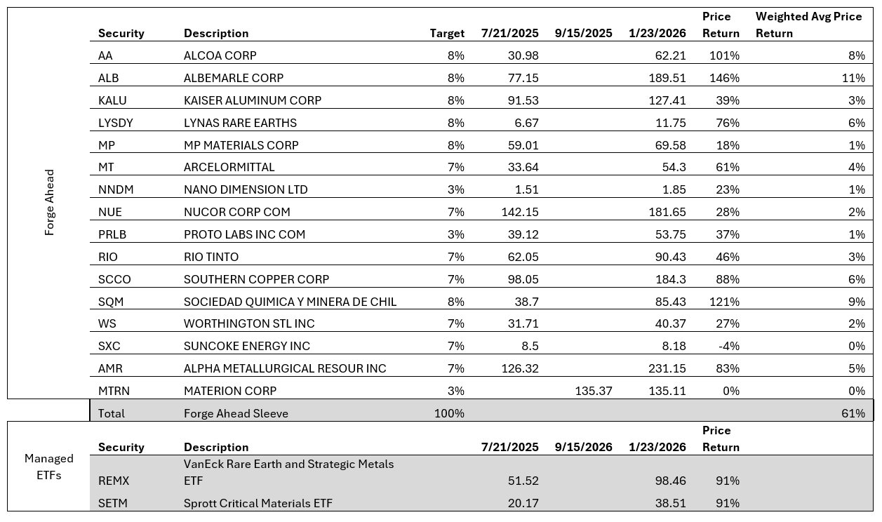 Beginning in April 2025 we began a series of monthly newsletters that permitted readers to follow along with our deep investment thesis work on Together We Build: Reindustrialization of America. The outcome of that research ultimately was a sleeve of physical and productive resource companies we dubbed “Forge Ahead” and added to Servant Client models.  We explicitly avoided significant direct Chinese resource and refining exposure that is available with the VanEck Rare Earth ETF (REMX) given our expectation of a more adversarial relationship between the two trading partners. This newsletter will summarize performance of the Forge Ahead sleeve as well as highlight policy and news updates that we believe further reinforce our thesis.